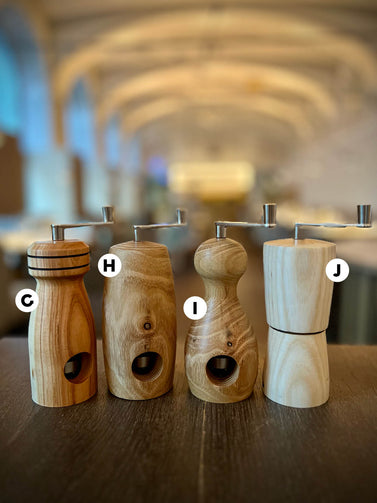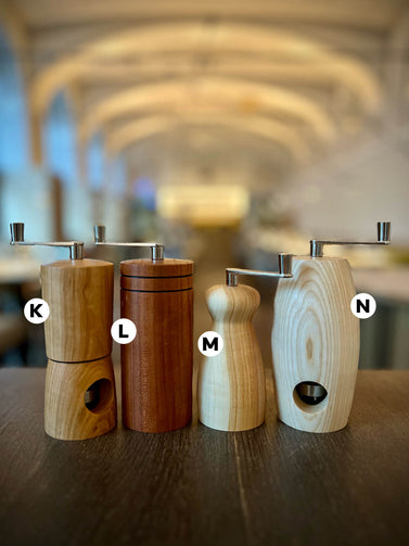 These mills were handmade for us (and you) by our dear friend Danilo in Tyrol. Each mill is a true one-of-a-kind, both in shape and wood. The wood (except for olive) comes from local forests: apple, pear, plum, ash, alder, oak, cherry, and Swiss stone pine.